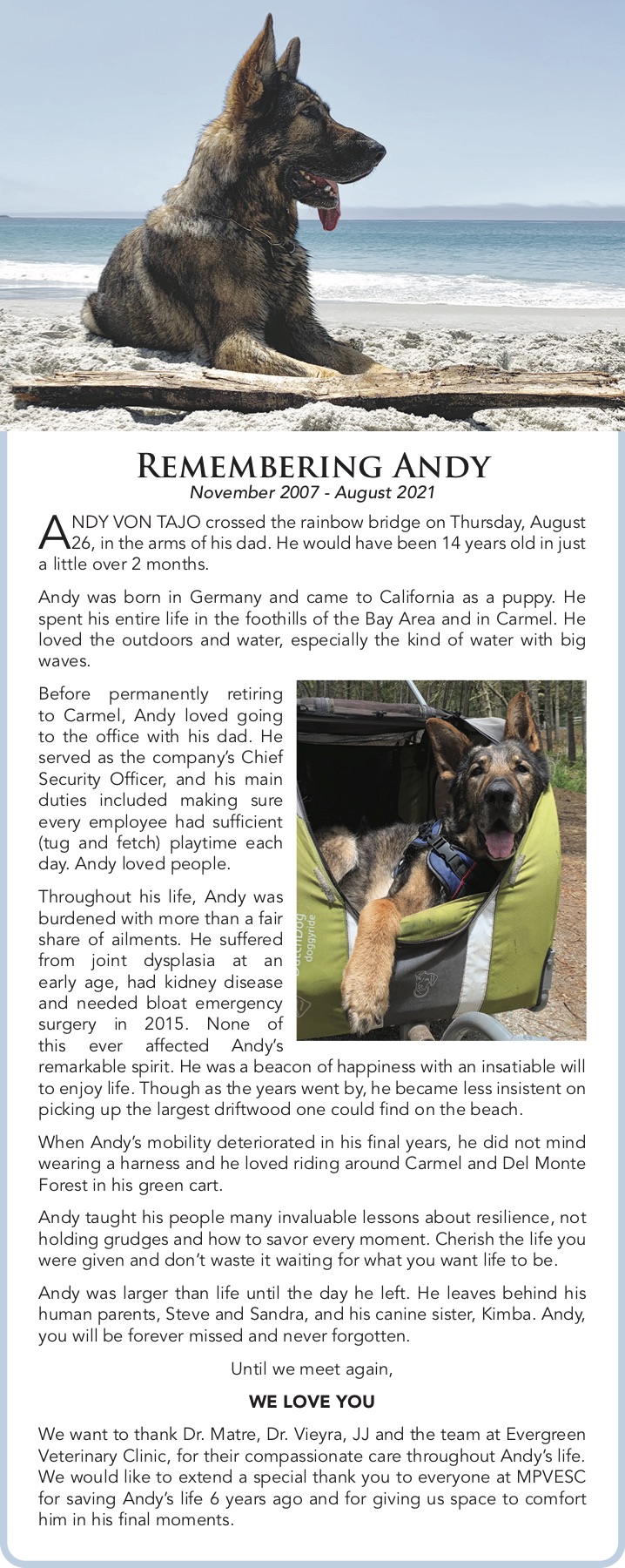 Andy was born on November 6, 2007 in the town of Appen in the Northern part of Germany. He arrived in the United States on January 22, 2008. Andy lived his entire life in the foothills of the San Francisco Bay Area and around Carmel by the Sea, California. Andy loved going to the office with his dad. He served as the company’s Chief Security Officer, and his main duties included making sure every employee had sufficient (tug and fetch) playtime each day. Andy loved people.